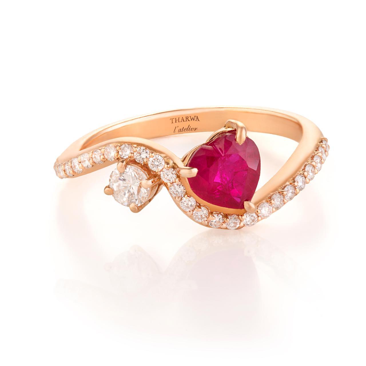 Crafted in warm rose gold, the Heart Fire Ring is set with 0.40ct diamonds and striking heart-shaped ruby.